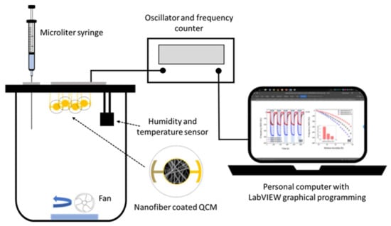 In recent years, the development of gas sensors to detect volatile organic compounds (VOCs) in the atmosphere is rapidly growing. Many gas sensors have been developed based on sensing chip-analyte interactions such as photoelectric [,], resistive [,], optical [], amperometric [], and acoustic wave interactions []. Quartz crystal microbalance (QCM) is one example of acoustic wave sensor platform based on acoustic-electric effect and mass deposition. The QCM sensor offers accurate, real-time, and convenient detection of gases or vapors [,] and humidity []. Nanostructured materials have become one of the most studied materials for devices, especially those used for gas sensing [,,]. These materials, including nanofibers, have a large specific surface area, high porosity, and interconnected porous structures [,,], which are advantageous for preparing gas sensing devices. The gas sensor prepared by nanostructured materials has a better sensitivity [,,] because of the increase in the specific surface area of the materials [,].