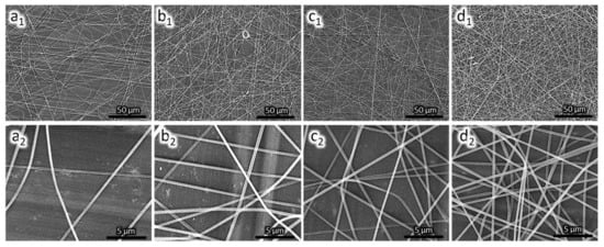 SEM image of PAN nanofiber on QCM surface; (a) PAN-NF 1; (b) PAN-NF 2; (c) PAN-NF 3; and (d) PAN-NF 4.
