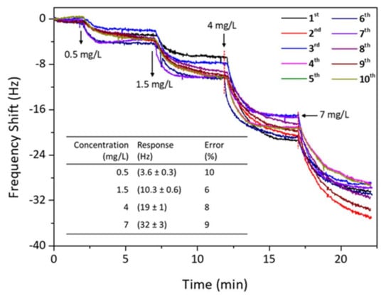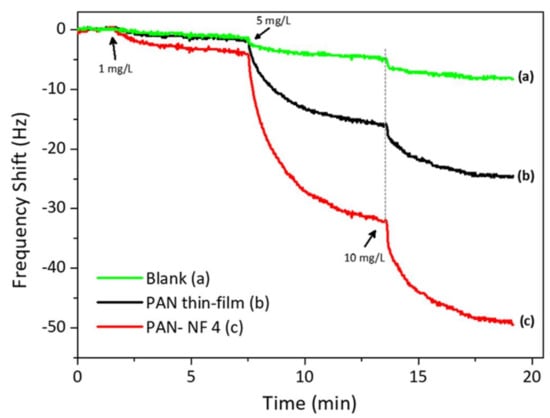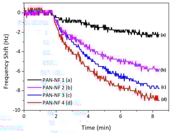 The frequency response of the fabricated sensor is shown in Figure 4. The response time is about 8–10 min. As the mass deposition increases, the frequency shift gets higher, allowing an assumption that the surface area of the PAN nanofiber sensor increases with increase in the PAN nanofiber loading mass as stated in literature []; hence, the surface area becomes the vital parameter in developing a gas sensor based on QCM technique. However, the mass loading affects the maximum electrode contact area fully covered by the nanofiber, as it limits the response of the sensor.