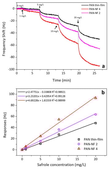 Figure 6a shows the frequency responses for QCM when modified with spin-coating and electrospinning. The concentration of the safrole vapor was predetermined from 1 to 20 mg/L. Upon safrole injection into the sensing chamber, the response was sharp and steady after several minutes. The QCM sensor coated with PAN-NF 4 can detect safrole of 1, 5, 10 and 20 mg/L, corresponding to a frequency shift of 8, 26, 55 and 95 Hz, respectively. At low analyte concentration, we observed that the response of the PAN nanofiber sensor gradually increased with the safrole vapor concentration. However, the high concentration of safrole vapor resulted in less response, which is due to saturation of the polymer surface covered by the analyte.