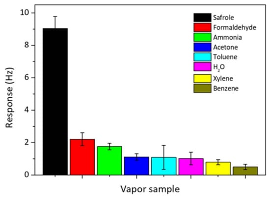 Many studies have reported that the unique structure of nanofibrous material with high porosity could be advantageous for achieving strong and rapid QCM responses to analytes [,]. A large shift in frequency indicates a strong interaction between safrole and PAN nanofibers. The large surface area, high porosity, and hierarchical structure of PAN nanofiber provide high diffusion for the analyte, which results in a big frequency shift. Furthermore, the high surface area of the PAN nanofibers allows safrole molecules to diffuse deep into the film, which helps increase the frequency response. The 3D porous structure alone is not enough to produce both excellent sensitivity and selectivity. In our next study, we will focus on in-depth investigation of the sensing mechanism of a polymer-modified QCM sensor.