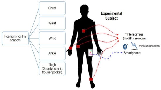 The sensing nodes were deployed on CC2650 SimpleLink™ Bluetooth low energy/Multi-standard SensorTag modules [], manufactured by Texas Instruments. Every SensorTag incorporates a CC2650 ARM microcontroller and a set of MEMS sensors, including an InveSense MPU-9250 Inertial Measurement Unit (IMU) which integrates three triaxial sensors: an accelerometer, a gyroscope and a magnetometer. The SensorTag modules, which are powered through a CR2032-type battery, support different wireless communications, which avoids wiring and provides the user with a complete freedom of movement. In particular, the sensing motes embed a multi-standard 2.4 GHz ultra-low power wireless MCU compatible with ZigBee, 6LowPAN or Bluetooth Low Energy (BLE) communications. In our prototype, benefiting from the fact that most current smartphones support BLE, a smartphone was selected as the central node of a BLE piconet. The piconet follows a typical star topology. Thus, the smartphone, which plays the role of the piconet master, receives all the packets containing the measurements captured by four SensorTags, which act as slaves in the BLE piconet.