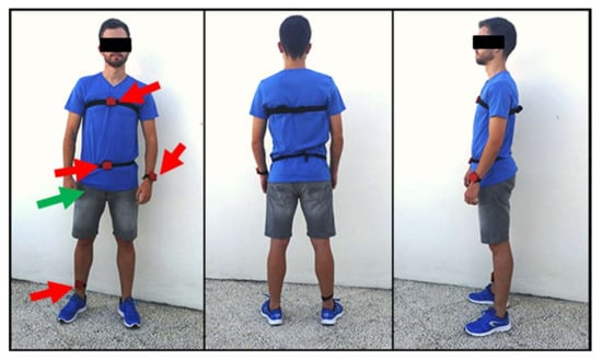 Example of the distribution of the sensors worn by an experimental subject. The green arrow indicates the position of the smartphone. Red arrows correspond to the SensorTag modules, which are attached to the user’s body by means of elastic bands.
