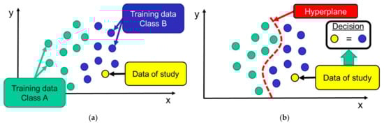 Thus, as reflected in Figure 5, from the training dataset the algorithm is capable of building a ‘maximum margin hyperplane’ that acts as a decision boundary to categorize and discriminate the samples. The hyperplane, which separates two multi-dimensional regions, is defined so that the distances to the nearest points (from both sides) are maximized []. Once that the system is trained, the classification of the samples is directly based on the region where the sample is included.