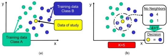 Operation of k-NN classifier: (a) the data under study is located among the training patterns aiming at finding the k nearest neighbor (in the example k = 5); (b) after detecting the k nearest samples, the new sample is classified considering the ‘majority vote’ (most common class) of its neighbors.