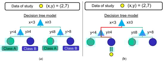 Example of an operation of a decision-tree algorithm: (a) after the training phase, the branches and the decision rules the tree are configured; (b) during the test phase, the features of an unclassified sample are utilized to apply the decision rules and determine the sample class.