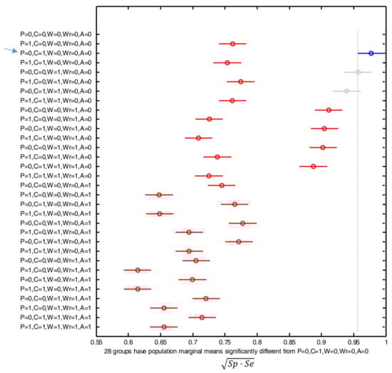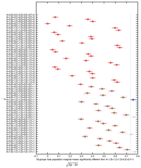 To proceed with the ANOVA analysis of the results, we focus the comparison on the series of the geometric means of the specificity and the sensitivity () which are computed for the different sets of test samples (defined in Table 2) and for every combination of input characteristic and considered sensors. The goal is to identify the combination of input features that lead to the best detection performance in a statistically significant way. In case that the best options do not differ significantly, the combination with a lower dimension (i.e., the lower number of features) should be preferred in order to reduce the computational complexity of the system (which is normally intended to be implemented on a wearable device, such as a smartwatch or a smartphone, which can exhibit memory and computation restrictions). This procedure is repeated for the four machine-learning algorithms, whose results are discussed in the following sub-sections.