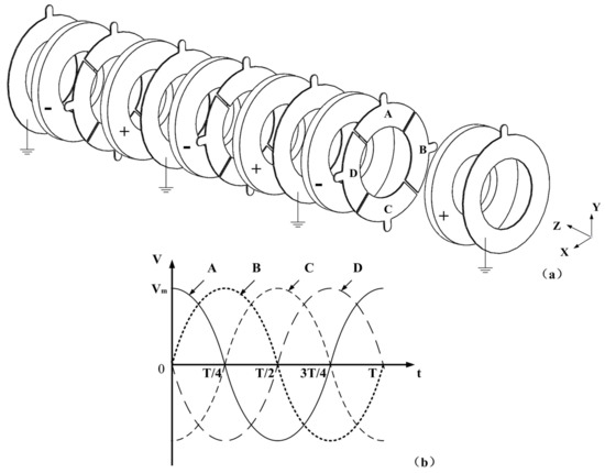 The electrodes are placed between the piezoelectric plates to apply the excitation signals. In each piezoelectric plate, the direction of polarization is the same. Some electrode slices are cut apart into four independent equal pieces, on which four different excitation signals, A, B, C and D, are applied. In detail, the two excitation signals of A and C have a phase difference of 180°, and they can generate a bending vibration around X axis. The other bending vibration around Y axis is produced by the two excitation signals of B and D. Therefore, two bending vibrations can be generated by a single group of piezoelectric ceramic plates by applying four different excitation signals. Six piezoelectric plates are used to enhance the power of the vibration as the drill structure is relatively huge. The bending vibrations of the two orthogonal directions can be controlled by the excitation signals. When these two bending vibrations have the same frequency and a phase difference of 90°, they can be coupled together and the movement on the drill will have a constant trajectory.