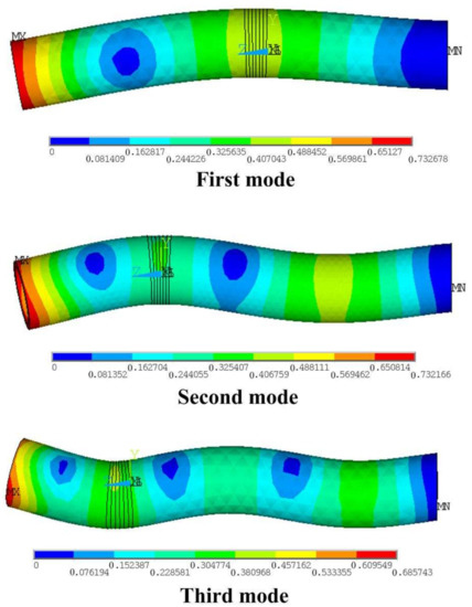 Figure 4. The vibration amplitude is not the only factor to decide the vibration energy: the vibration frequency is also significant. The vibration amplitude is selected as the main parameter to design the transducer in this work. From the results, the first mode is selected for the design and the experiment because large vibration amplitude is required.