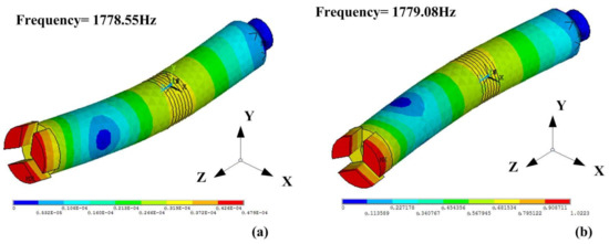 Figure 5, which makes the mode coupling become easy. Thus, when four excitation signals with the same frequency and the same amplitude, but different initial phases of 0°, 90°, 180° and 270°, respectively, are applied on the electrodes, and the frequency is the same with the resonant frequency of the bending modes, an efficient and constant vibration will be generated on the drill.
