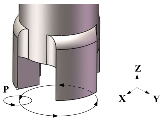 In the analysis, sinusoidal AC voltage is the input signal of the transducer. Since the hybrid bending vibration modes are made of two independent bending modes of different directions, a simple harmonic vibration will be generated at the drill bit in the same direction if sinusoidal AC voltage is applied on the transducer in one direction. A particle P on the edge of the drill bit is chosen to be analyzed.