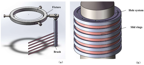 Since the drill was connected to a bench drill to rotate and feed downward, a simple brush device was designed, which was used to conduct electric signals to the transducer and prevent the coiling of the wires. The fixture of the brush was made of steel, as shown in