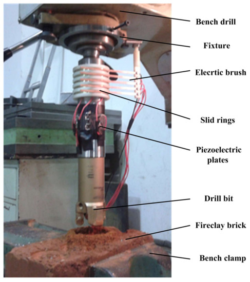 Figure 12. An electric brush was connected to the bench drill and the slip rings were placed on the drill stem, which could prevent coiling of wires. During the experiment, the rotary motor of the drill bench was used to provide the power for the rotation of the drill directly. Several loads were suspended around the hand wheel of the bench drill, which provided a constant torque to drive the machine and gave a constant force to feed downward. The precise value of the drilling force was measured by a force meter. The piezoelectric transducer was connected to an AC power source which could control the vibration condition of the drill to conduct comparison experiments. Since the fireclay brick had a regular shape, it was clamped by the clamper of the bench.