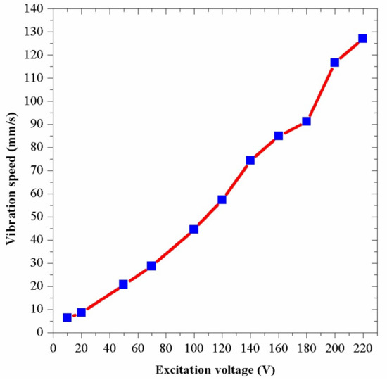 Figure 13 shows the result of the experiment. The experimental curve shows that the vibration speed increases almost proportionately with the increase of the excitation voltage. In this figure, the vibration speed is about 117 mm/s when the excitation voltage is 200 V. By using Equation (4), the vibration amplitude is calculated to be 14.7 μm. Nevertheless, the above FEM analysis has shown that the vibration amplitude is about 16.2 μm when the excitation voltage is 200 V.