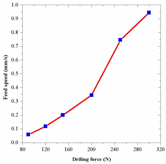 Since the experiment required a suitable drilling speed to minimize the operation errors, an appropriate drilling force should be found. To achieve this goal, several experiments were conducted when the rotary speed of the drill was 70 r/min and there was no vibration added on the drill. The results are shown in