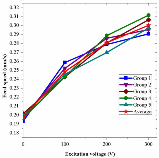 Figure 15. In the figure, a common characteristic is that, along with the increase of the excitation voltage, the drilling efficiency is improved. In the results, different groups have different feed speeds when the same voltage is applied because the surface conditions of the bricks have some small discrepancies, which results in the differences between the hardness of bricks. In addition, the reading errors contributes to the differences of the feed speeds. In