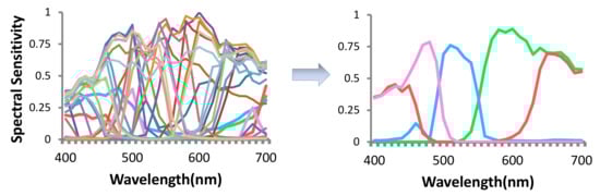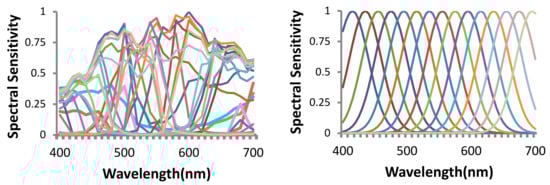 Channel Selection: references [,] optimize spectral sensitivity of channels with a regular three-channel RGB Bayer color filter array (CFA) , while references [,] optimize channels to minimize the error in spectral recovery, but only for spectral data that have strong priors like known distribution of the captured spectral functions (e.g., daylight []). Such domain-specific priors yield content-dependent methods. More importantly, theoretically conducive spectral sensitivity of the channels are assumed (e.g., radial basis function [,], Fourier basis function []). This yields poor results in practice due to a large deviation of the sensitivities of commercially available filters from such well-behaved functions [] (Figure 1).
