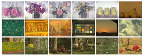 Several sample images of our natural multispectral images dataset. Each image was captured using an SOC-730 hyperspectral camera with a spatial resolution of 600 × 800 and 31 spectral measurements (400–700 nm) at each pixel.