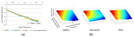 Spectral components—prior works observe the following: (a) illumination and reflectance spectra of natural or man-made objects and phenomena are relatively smooth [] and therefore frequency-limit functions can be used to approximate them []; (b) in addition to being smooth, these illumination and reflectance spectra also show remarkably similar energy distribution in the frequency domain (Figure 3). In fact, the surfaces formed by these distribution functions have a shape close to an exponential function with an exponent of (−2). Therefore, they follow Steven’s power law of human perception. Steven’s Law is the fundamental empirical law of human perception that most human responses to input environmental stimuli is related by a power function [].