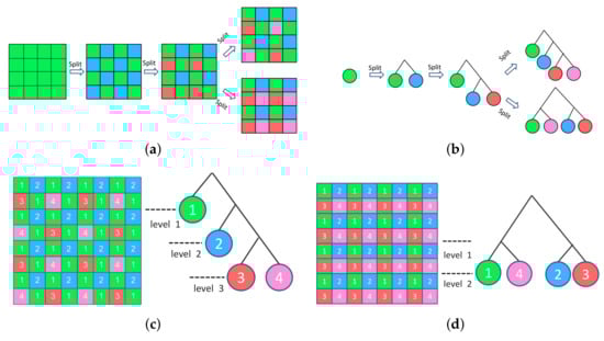 In the binary tree based MSFA design [], the generation of the MSFA is an iterative process of binary splitting as illustrated in Figure 4a. A parent channel evenly divides into two children channels in each splitting, increasing the number of channels by one while scaling down the sampling rate of the children created by half. Reference [] shows that, since the MSFA patterns satisfy the three properties above, the sibling channels are exchangeable. We can use binary trees to represent such MSFA patterns (Figure 4b) where a leaf node at level l has a sampling rate of . Figure 4c,d shows that the patterns generated may not be unique. However, the binary tree for a particular sampling rate combination is unique.