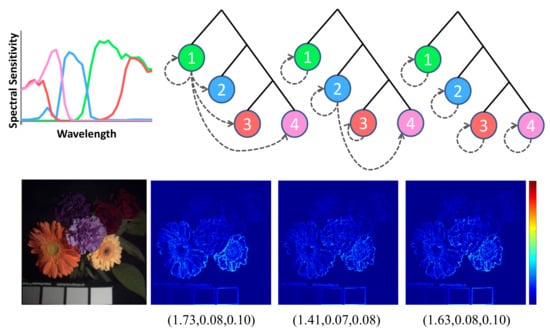 To evaluate our overall models, we consider three different random combination of channels, MSFA patterns, and demosaicing orders as shown in Figure 9. We adopt the bilinear interpolation method and the binary tree-based generic(BTG) demosaicing method [] as the channel-independent demosaicing, and adopt state-of-the-art guided filter (GF) method [] and residual interpolation (RI) method [] as the channel-dependent demosaicing in reconstruction. In error estimation, we used scale factor and , and random Gaussian noise with db to the response of camera. The values of the scale factors are directly obtained from the statistics of the multispectral images in the used datasets.