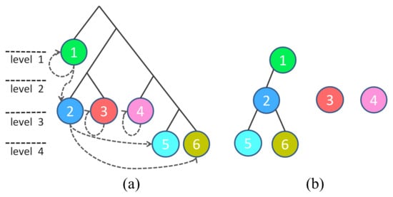 (a) The binary tree of a MSFA pattern and the demosaicing order; (b) the corresponding demosaicing forest.