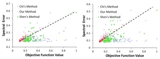 Relationship between spectral estimated error and objective function value of previous methods and our method on “natural” (left) and “paper” (right) dataset in []. Note the scatters of our method distribute along the black dashed line while the scatters of the previous method distribute irregularly.
