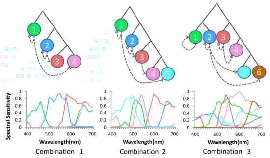 In this section, to optimize reconstruction accuracy, we will seek possible combinations of channels, MSFA patterns, and demosaicing patterns that minimize the objective function (Equation (6)) with specific parameters. We propose an optimization method that selects n channels from m candidate channels () and determines the MSFA patterns and demosaicing orders to facilitate accurate recovery of spectral reflectance of most natural and man-made objects.