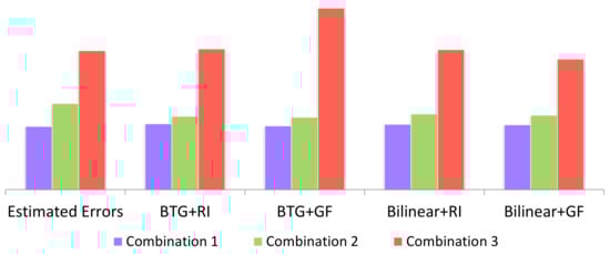 Comparison between estimated errors and actual reconstruction errors using different demosaicing methods (BTG + RI, BTG + GF, Bilinear + RI, Bilinear + GF) with the channels and patterns shown in Figure 9. The estimated errors are scaled for comparison.