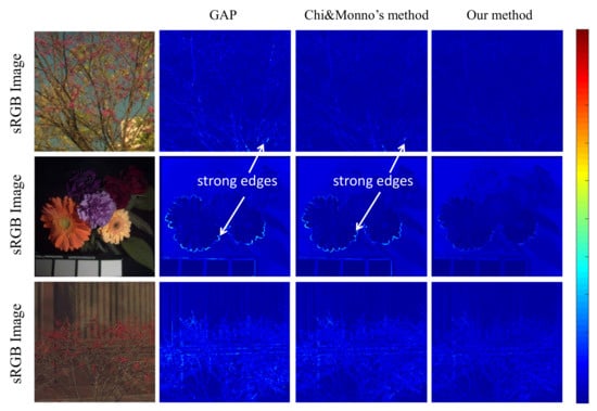 Reconstruction spectral error of multi-spectral images in our database (the 1st row), CAVE spectral database (the 2nd row), and Harvard’s database (the 3th row) using a GAP camera, Chi and Monno’s method and our mosaic camera (see Figure 11). Please zoom in and see sharp edges in gray images.