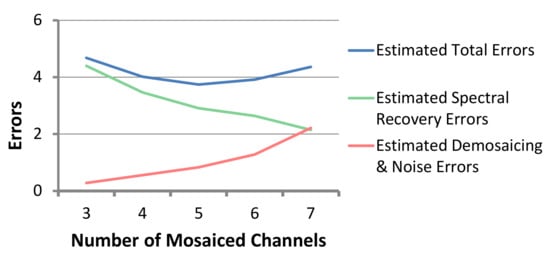 Our estimated error (spectral recovery error, demosaicing error and imaging noise) on “CAVE” spectral dataset [] with a different number of mosaiced channels. The errors reveal the optimal number of channels to be around 5–6. Here, we use the MSFA and demosaicing method in [].