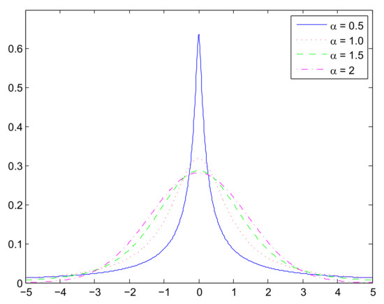 Figure 1 shows the probability density functions (PDFs) of alpha-stable distributions with different values of . We can see that the distributions of this class are all bell-shaped, with increasing density on the left and decreasing on the right. In addition, the tail of the bells becomes heavier as the value of decreases.