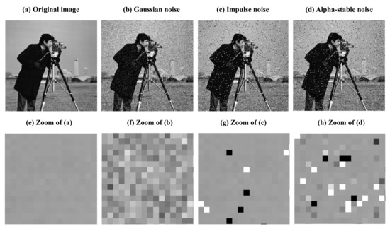 We would first like to illustrate the different effects of Gaussian noise, impulse noise, and alpha-stable noise. Figure 2a shows the original Cameraman image, and Figure 2b–d represent, respectively, the images degraded by Gaussion noise, impulse noise, and alpha-stable noise (with ). Figure 2e–h show the zoomed top left corner of Figure 2a–d.
