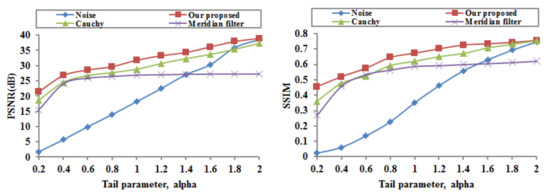 Figure 3 gives the PSNR and the SSIM of the noisy Cameraman image and the recovered images resulting from the proposed image denoising model, the Cauchy model, and the meridian filter at different tail parameters . As the tail parameter increases, the PSNR values and the SSIM values become higher in all of these methods; And as the tail parameter decreases, the superiority of the proposed method becomes obvious. Moreover, our proposed image denoising model outperforms the Cauchy model and the meridian filter in terms of the PSNR and SSIM at the same tail parameter. In all, the proposed model significantly outperforms the commonly employed image denoising models in impulsive noisy environments (with small values) while providing comparable performances in less demanding, light-tailed environments (with high values). In particular, the PSNR values of our proposed model are all above 30 dB at the tail parameter of , and such values are considered to be perfect recovery results, so we employ the value of , which, in this part, follows the alpha-stable distribution .