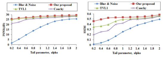 The proposed image deblurring and denoising model is applied to the blurred and noisy Cameraman image at different tail parameters . The PSNR and SSIM are computed and provided in Figure 4.