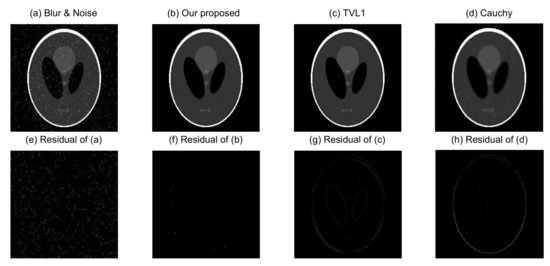 Noise interferences often occur in many systems such as wireless communications [1] and social networks [2,3]. Hence, images are inevitably corrupted by both blur and noise during the acquisition and transmission. Hence, the restoration of clean images from blurred and noisy observations is a fundamental task in the image processing community. A wide range of approaches has been proposed to remove additive Gaussian noise [4,5,6]. However, many other noises, such as impulse noise [7,8,9,10,11,12], multiplicative noise [13,14], Poisson noise [15,16,17], Cauchy noise [18,19], and Rician noise [20], commonly appear in the real world and thus are studied by many researchers. Another impulsive noise is often caused by alpha-stable noise, which normally appears in many applications, such as wireless communication systems, synthetic aperture radar (SAR) images, biomedical images, and medical ultrasound images [21,22].