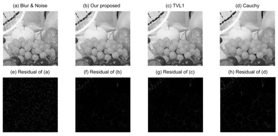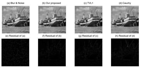 In general, larger PSNR values indicate that the recovered image can pick up more information. It is obvious from Table 2 that a notable performance improvement has been achieved by the proposed image deblurring and denoising model as compared with the TVL1 model and the Cauchy model. For example, the PSNRs of the Cameraman image, resulting from the TVL1 model and the Cauchy model are 27.283 dB and 26.244 dB, respectively, while our proposed model gives 28.327 dB, implying that our proposed model provides an improvement of 2.083 dB, as compared with the Cauchy model. This is consistent with the visual effects of Figure 5, Figure 6, Figure 7 and Figure 8.