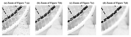 Figure 8a–d are the magnified top left regions of Figure 7a–d, respectively. It is clear from Figure 8 that the reconstruction result obtained with our proposed method produces characterizations that are superior to those of the TVL1 and Cauchy methods. We also can see that the restored result of the proposed method can maintain salient features of the line in the original image and has clearer outlines and reduced noise and blur effects.