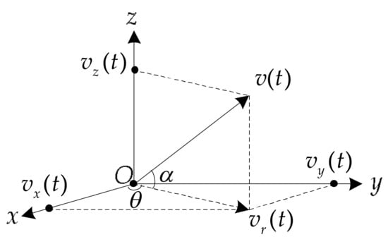 The vector sensor is the sensor used in the underwater vector field measurement, which is the combination of pressure sensor and velocity sensor (pressure gradient sensor, accelerometer, displacement meter, etc.) []. The vector sensor outputs the pressure signal and velocity signal which contains three orthogonal components . and , in which is the target signal. The geometric relationship between the orthogonal components is shown in Figure 1. is the horizontal azimuth angle (range: ), the x-axis positive direction is , is the elevation angle (range: ), and the horizontal plane (xoy plane) is [].