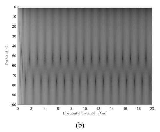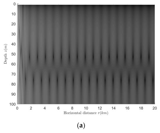 The shallow water pressure field excited by an aerial target and a surface target are shown in Figure 3a,b. The simulation results show that the aerial target field is similar to the equivalent surface target field, and the only difference between the above two fields is the amplitude. The mean value of the amplitude difference is 11.30 dB, while the theoretical difference value is , both values are in good agreement, so the aerial target can be equivalent to a surface target.