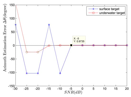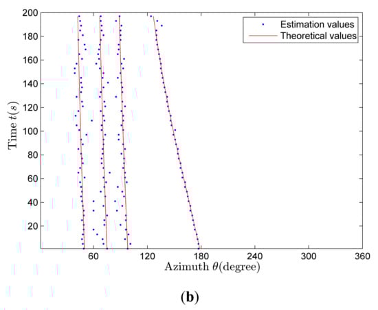 In addition, in the case of multi-target, some target signals are stronger and some target signals are weaker. Assuming that the first target signal is strongest, the azimuth-estimation effect of the remaining targets may still be poor based on the improved azimuth-estimation method, because the remaining target signals are weaker signals relative to the first target signal. Ideally, the signal of the first target should not affect the azimuth estimation of other target-radiated signals. The azimuth-estimation results of other targets should not be within the range of the first target azimuth-estimation value . However, in practice, the strong signal will have a great influence on the azimuth estimation of the weak signals, resulting in the azimuth-estimation results of the strong signals being contained in the azimuth-estimation results of the weak signals. To eliminate the influence of strong signals on weak signals, we add the threshold control. The threshold (that is, the permissible error of the azimuth estimation) is . The specific steps of the added algorithm about the threshold control are as follows: