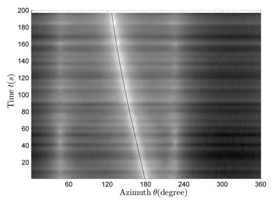 Figure 10 is a rough estimation of the bearing-time recording at full frequency and the black line is the azimuth theoretical curve. There is only one curve for the azimuth variants in Figure 10. With reference to Figure 9 and Figure 10, it can be seen that the received signal is radiated by one target.
