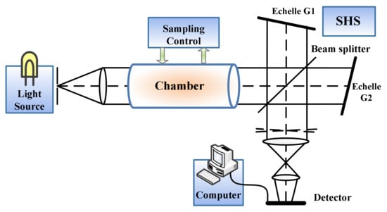 Light source is the sensing medium of the system providing the energy and characteristic spectral lines required by the system. Chamber is the place where light source and gases react with each other. Sampling control module controls the type and concentration of test gas. SHS is used to generate and collect 2D interferogram. Computer realizes the analysis of interferograms.