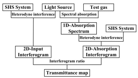 Firstly, a light source was input into the SHS system to get its 2D input interferogram. Then, the light source was input into light absorption gas detection system to get 1D absorption spectrum and it was input into the SHS system to get the 2D absorption interferogram. Finally, the T-map was obtained by taking the input interferogram and the absorption interferogram into Equation (10).