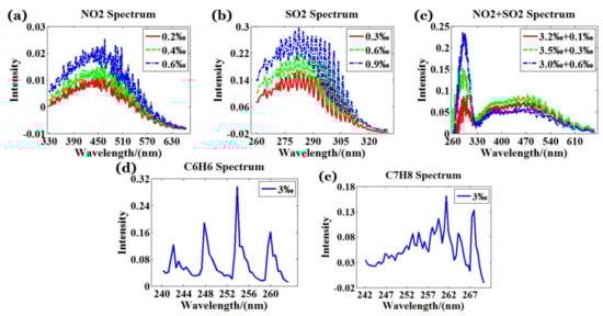 Step 2: Fill the chamber with the test gases (NO2, SO2, NO2 + SO2, C6H6, C7H8) by Vacuum pump and MFC (The concentrations of NO2 are 0.2‰, 0.4‰, 0.6‰ respectively; The concentrations of SO2 are 0.3‰, 0.6‰, 0.9‰ respectively; The concentrations of NO2 + SO2 are 3.2‰ + 0.1‰, 3.5‰ + 0.3‰, 3.0‰ + 0.6‰ respectively; The concentrations of C6H6 and C7H8 are all 3‰). In addition, the 1D background spectrum, input spectrum and absorption spectrum were collected, respectively.
