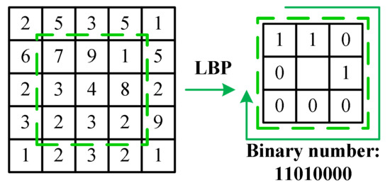 LBP [43] is defined as a grayscale invariant texture measure and is a useful tool to model texture images. The original LBP operator labels the pixels of an image by thresholding the three by three neighborhood of each pixel with the value of the central pixel and concatenating the results binomially to form a number. Figure 8 shows an example of obtaining an LBP micropattern when the threshold is set to zero. The histograms of these micropatterns contain information of the distribution of the edges, spots, and other local features in an image.