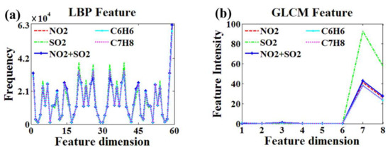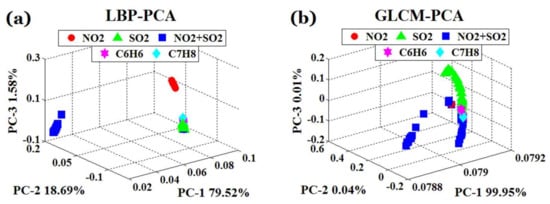 In Figure 10, PC1, PC2, PC3 respectively represent the percentages of the original information contained in each principal component of PCA analysis, while the axes reflect the distribution of scattered points. From the first three PCA results (cf. Figure 10) we can see, in the PCA scattergram of LBP, that NO2 and NO2 + SO2 can be separated obviously, but the distribution of characteristic data of SO2, C6H6 and C7H8 overlaps seriously. In the PCA scattergram of GLCM, NO2 and SO2 can be separated obviously, the distribution of NO2 and NO2 + SO2 overlaps slightly, the discrimination of SO2, C6H6 and C7H8 is a little better than that of LBP, but the overlap still exists.