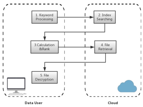 In the process of search and retrieval, the cloud helps the user to find the top-k relevant files according to the keyword which the user submits. It is noteworthy that only authorized users who are capable of generating the trapdoor are entitled to search the encrypted files. The trapdoor is used to search for the intended keyword in the cloud. The process is divided into five steps. For better understanding this process, we illustrate the five steps in Figure 2, and present the related computational components for these steps.