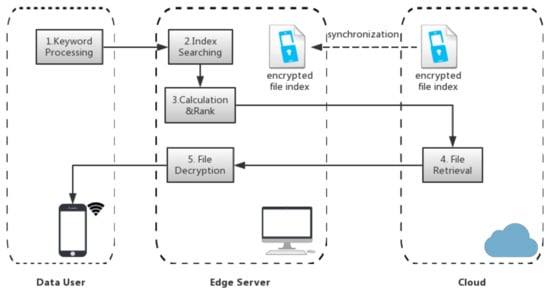 After the edge server downloads the file index, the workload of Index Searching (step 2 in the process of file search and retrieval introduced in Section 3) can be handled by the edge server. So, the search request is sent to the edge server but not the cloud. The data user could send the key to the edge server through a secure connection, and the key is used to decrypt the posting list related to the query keyword. The process of encrypted file search and retrieval in ENSURE is shown in Figure 3 and follows the steps: