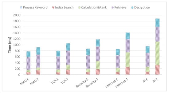 - File Retrieval: The time consumption of this step mainly depends on the network bandwidth accessing the cloud. The higher the bandwidth, the faster the speed of file retrieval. In both of the schemes, the cloud sends the relevant files back upon request. The files are only determined by the keyword. Thus, if the network condition is the same, the time consumption exhibits almost no differences between the two schemes in this step.